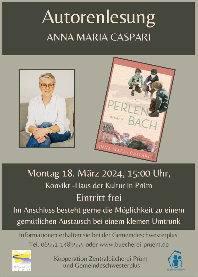 Die Autorin Anna Maria Caspari liest am Montag, den 18. März 2024 um 15 Uhr im Konvikt - Haus der Kultur aus ihrem Roman „Perlenbach“ – dem zweiten Buch nach dem erfolgreichen Eifelroman „Ginsterhöhe“."Perlenbach" spielt Ende des 19. Jahrhunderts bis zum Beginn des Ersten Weltkriegs in Monschau. Damit bildet der historische Eifel-Roman die Vorgeschichte zu "Ginsterhöhe" und ist Teil einer geplanten Trilogie. Im Mittelpunkt stehen die drei Freunde Wilhelm, Jacob und Luise, die sich als Kinder am Perlenbach ewige Freundschaft schwören.